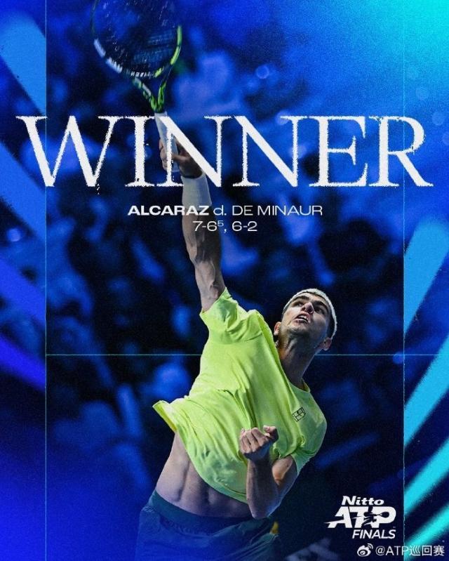 ATP总决赛吉米·康纳斯组首轮,头号种子阿尔卡拉斯7比6(5) 6比2击败7号种子德米纳尔,顺利取得小组赛开门红。阿尔卡拉斯对阵德米纳尔5战全胜,其中本赛季3战全胜。
